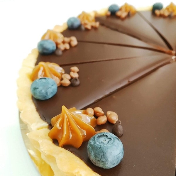 Mandulás linzer tészta aljon krémes sós karamell réteg, rajta lágy valódi belga étcsokoládé krém. Karamell és csokoládé ganache csúcsokkal, gabona golyóval, idény gyümölccsel díszítve.